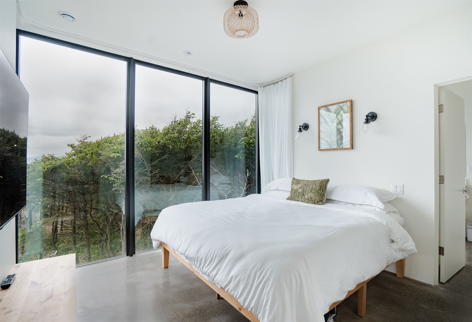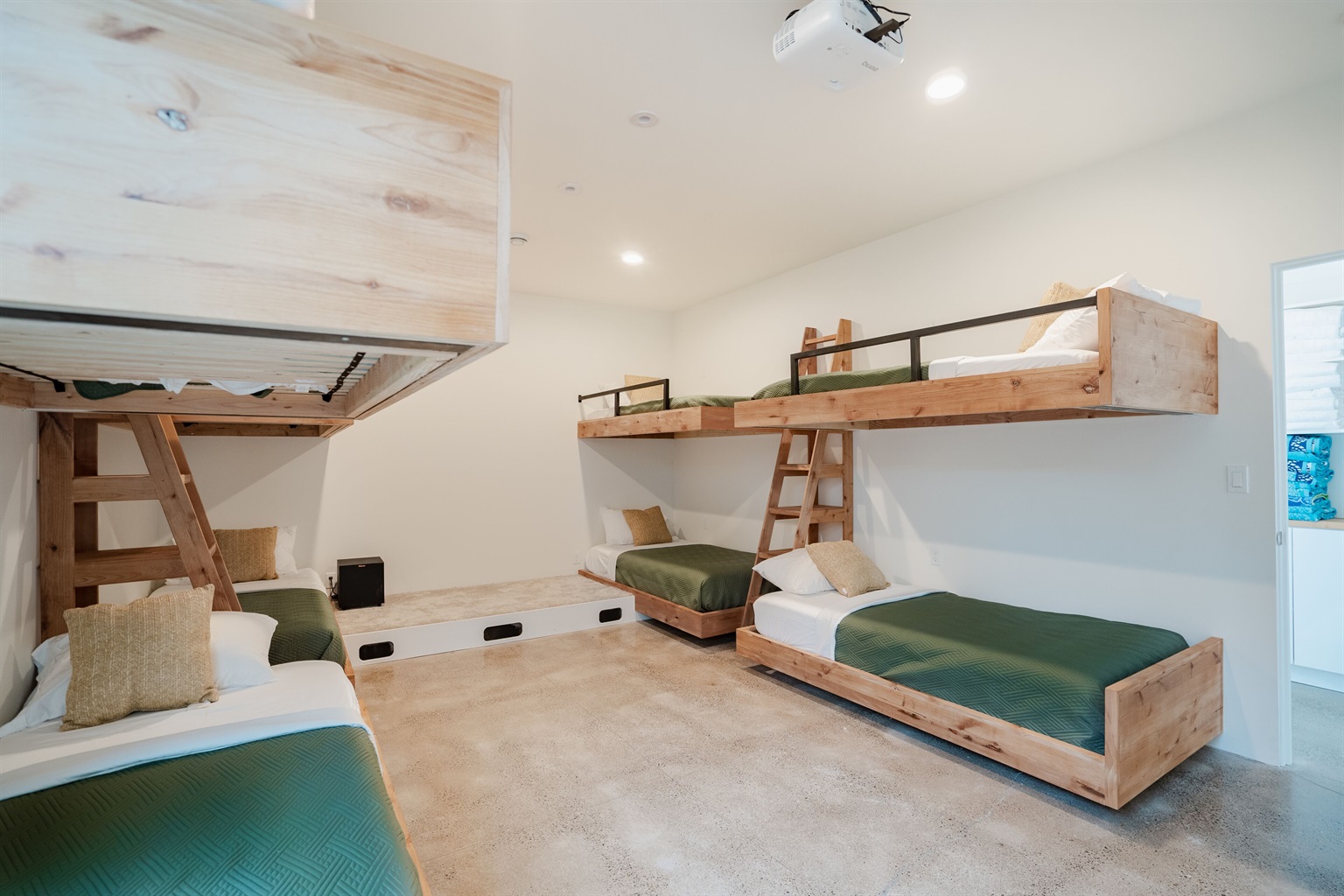 5 Ocean-front master bedrooms with king beds, private baths, 70" smart TV's, and 1 Forest view bunkroom with 8 twins, a private bath, a 2nd Xbox X w/4K projector & surround sound. 4 of the 5 oceanfront masters have private covered decks with glass railings, and the 5th oceanfront master has 3 walls of windows cantilevering out over the forest.