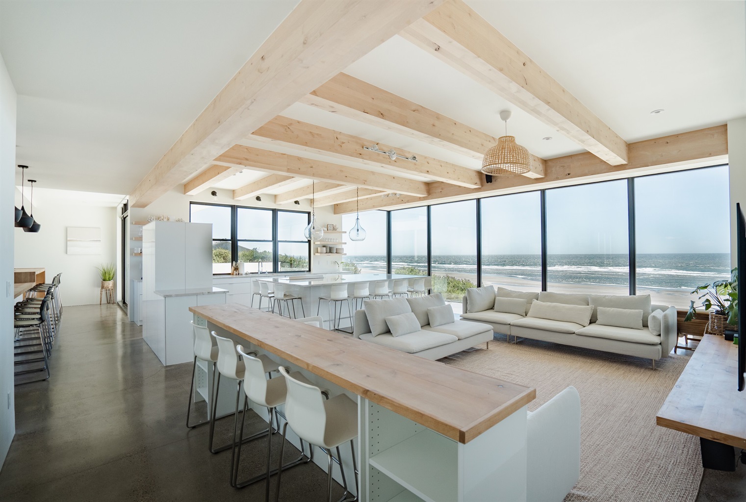 - Beach break directly out front for surfing, bodyboarding, body surfing, or skim boarding, though better waves are 5 minutes South at Pacific city.Floor to ceiling and wall to wall windows let you take in views of the Pacific ocean from Haystack Rock to Cape Lookout throughout the home, perfect for viewing whales, seals, sea lions, orcas, bald eagles, pelicans, and other NW wildlife. Forest Edge is a 6 bedroom/7 bathroom modern home cantilevered over the beach and forest, all on one floor with just the entry and parking under the home. The fully stocked kitchen features a giant Quartzite kitchen island for everyone to gather around with seating for 14, imported 36" induction cooktop, 36" Gaggenau oven, 2 sinks, Bosch dishwasher, Samsung bespoke all fridge & all freezer, Breville Espresso, 2 microwaves, and a bonus kids area under the island. Additional ocean facing bar seating and forest facing bar seating allow everyone to sit nearby. Kitchen windows and sliding glass doors open to a deck with glass railings & 36" propane griddle for outdoor living.